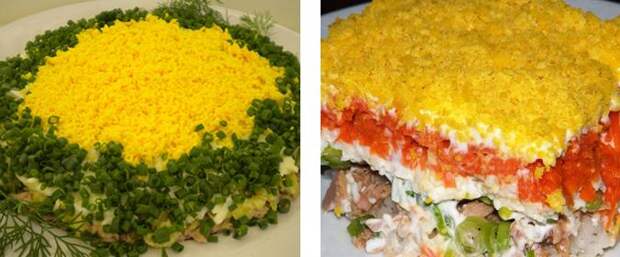 Как готовится салат "Мимоза", думаю, знают все. Премудростей особых тут нет. Обычно выкладывается несколько слоев, которые могут повторяться и чередоваться в зависимости от ваших желаний и возможностей: