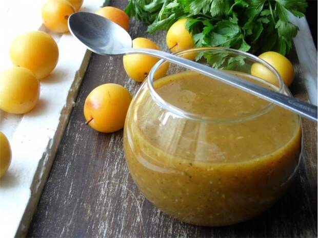 Цвет соуса будет зависеть от того, какая слива у вас растет. Желтая алыча даст зеленый цвет,