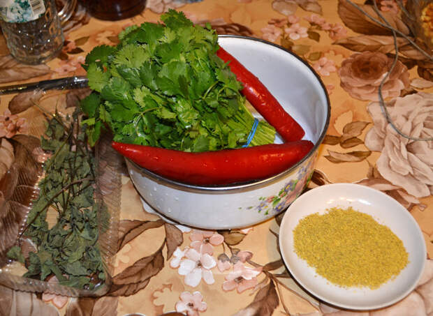Взвесим. На 6 кг сливы нам потребуется 2 стакана сахара, 6 столовых ложек соли, 200 гр свежей кинзы, немного свежей или сушеной мяты, 2 крупных головок чеснока (можно больше), 1-2 острых перца (смотрите, не переборщите), 2 столовые ложки хмели-сунели.