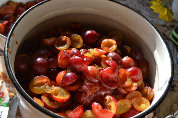 Вымоем сливы и, разрезав пополам, удалим косточки.