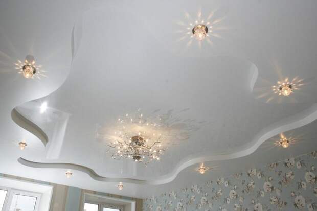 Натяжные потолки – это полотна, в качестве исходного материала для которых используется пленка из поливинилхлорида (ПВХ) или полиэстеровая ткань. Из них и выкраивают поверхность потолка. Популярны потолки, имитирующие ночное небо, металл, замшу, мрамор. Используя этот материал, можно создавать конструкции причудливой формы по индивидуальным дизайнерским проектам.