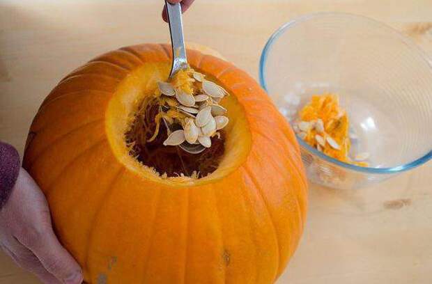 При недолгом хранении поделки подойдет простая сушка тыквы, которая не займет много времени. Для этого следует аккуратно срезать горлышко и удалить ложкой мякоть и семена.