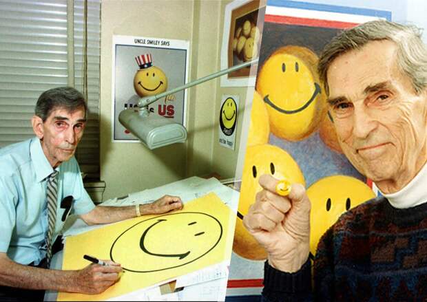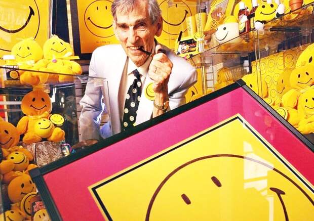 Харви Болл и его смайлики, включая тот, что был первым - на простой жёлтой бумаге