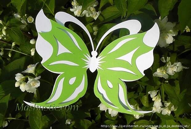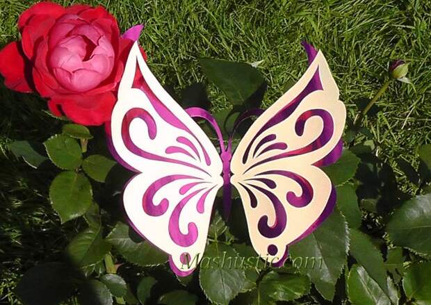 Такие чудесные ажурные двухслойные бабочки вы можете изготовить вместе с ребенком и украсить ими детскую комнату или подарить друзьям. Ребенок, если еще маленький, может вырезать более простой, нижний шаблон, ну а вы постараетесь создать красивый верхний слой. И наградой вам обоим будет вот такое ажурное чудо!