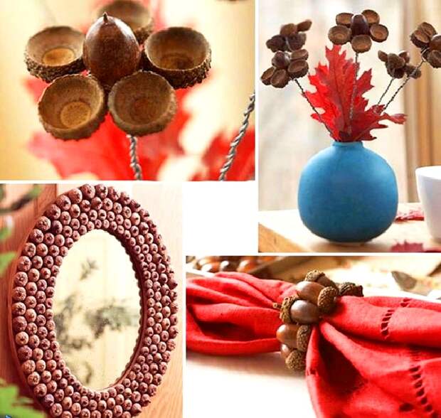 Мне очень нравится Осень - столько разных природных материалов вокруг! Можно запросто придумать огромное количество разных вещиц, которые будут украшать дом, дачу или сад. При помощи желудей, дубовых или кленовых листьев легко создать в доме волшебную осеннюю атмосферу уюта и тепла. Даже простой букет из веточки с дубовыми листьями выглядит шикарно.