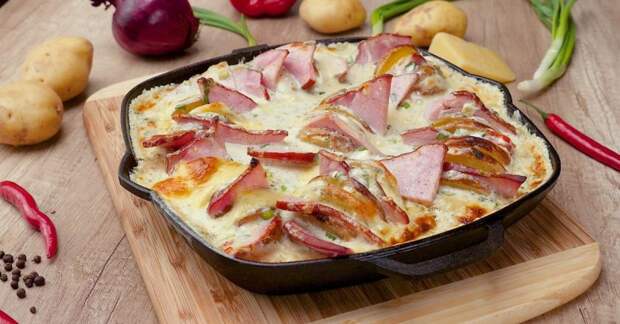 Сырно! Суперсырно! Это блюдо не для тех, кто считает калории, а для любителей поесть вкусно и плотно. Только представьте, насколько эффектным получится обычный картофель, если запечь его под слоем творога, чеддера и моцареллы. Но изюминка гарнира кроется скорее в клубнях, предварительно зафаршированных твердым сыром и ветчиной или беконом.