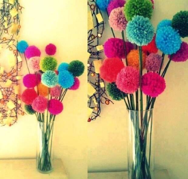 К помпонам у меня любовь особенная, влюблялась я в них по нарастающей. Сначала я восхищалась цветами из помпонов в вазочках и в украшении интерьера...