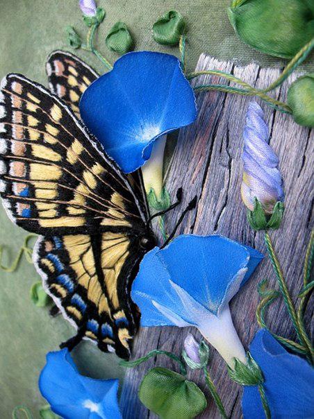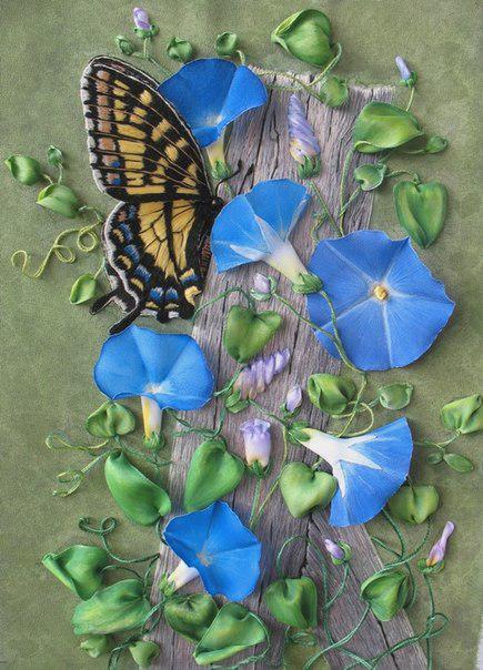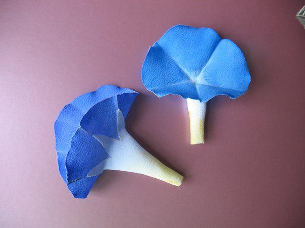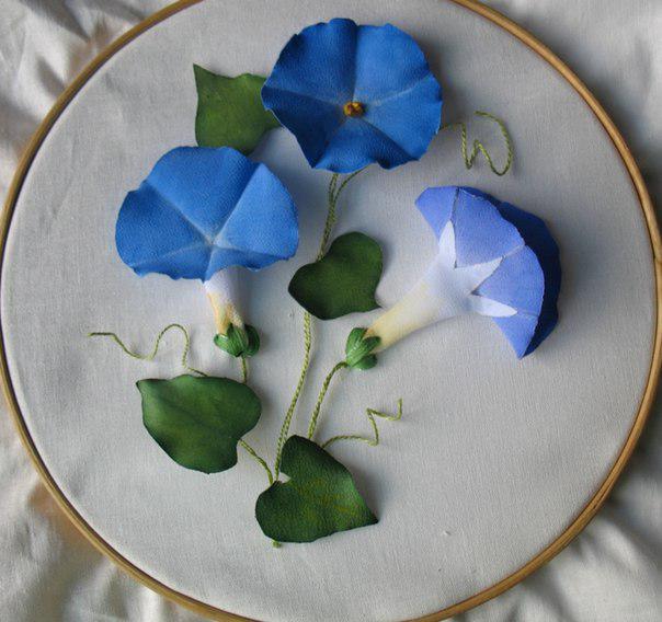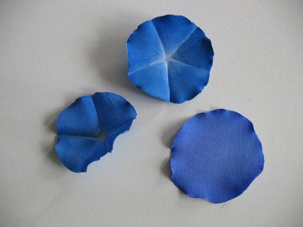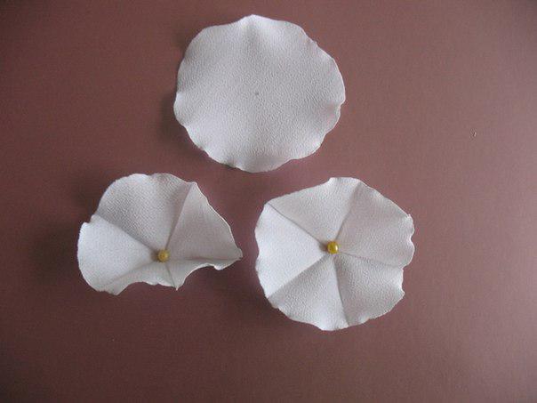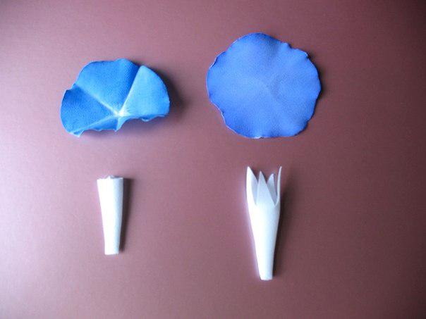 Детали для цветков «прямосмотрящего» и приподнятого обрабатываю следующим способом: складываю поочереди по всем пяти линиям деления и с изнанки быстро провожу пламенем зажигалки. Ткань должна слегка оплавиться и в результате получится вогнутая чашечка вьюнка.