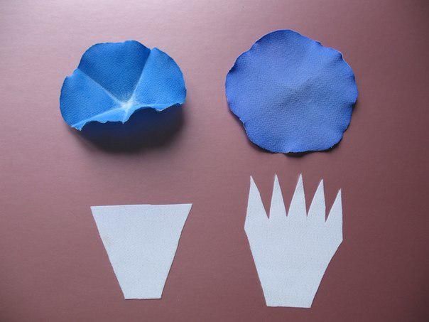 5. Делаю деталь для ножки приподнятого цветка в форме трапеции. Для цветка, повернутого боком, деталь - также в форме трапеции, но большее основание трапеции делаю немного длиннее и вырезаю на нем уголки