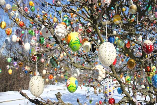Пасхальных яиц на дереве уже порядка 10 тыс., ведь Крафт получает посылки со всего мира.