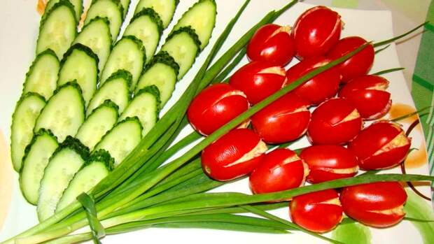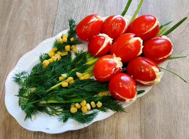 Очень оригинальный, вкусный и невероятно красивый рецепт "Тюльпаны из помидоров". Чудесная идея эффектного оформления простой закуски. "Цветы" в ярком букете - это помидоры с начинкой из сыра, крабовых палочек, майонеза и чеснока. Впрочем с начинкой можно экспериментировать по своему вкусу. Приготовьте "Тюльпаны из помидоров", и это блюдо украсит ваш праздничный стол и, несомненно, привлечет всеобщее внимание.