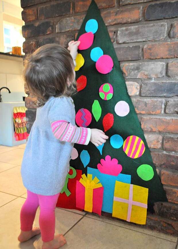 Сделайте своим малышам настенную елочку любого ворсистого материала, к которому хорошо прилипают вырезанные из ткани игрушки. Пусть ребенок играется и наряжает свою собственную елочку