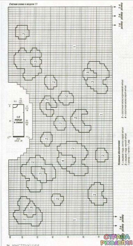 УЗОР 6: вывязанный узор (на всех петлях + 2 кромочные) = вязать согл. счетной схеме. Участок каждого цвета вязать нитью из отдельного клубка, при смене цвета перекрещивать нити на изнаночной стороне во избежание образования дырочек. При выполнении маленьких «пятен леопарда» телесную нить свободно протягивать на изнаночной стороне работы.