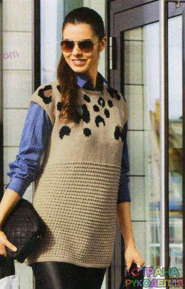 ВАМ ПОТРЕБУЕТСЯ: пряжа (60% натуральной шерсти, 40% полиакрила; 120 м/ 50 г) для туники - 400 (450) 450 г, для шарфа 150 г светло-серой, а также 50 г черной и остатки коричневой и серой; спицы № 4,5 и 5; короткие круговые спицы № 4,5; длинные круговые спицы № 5.