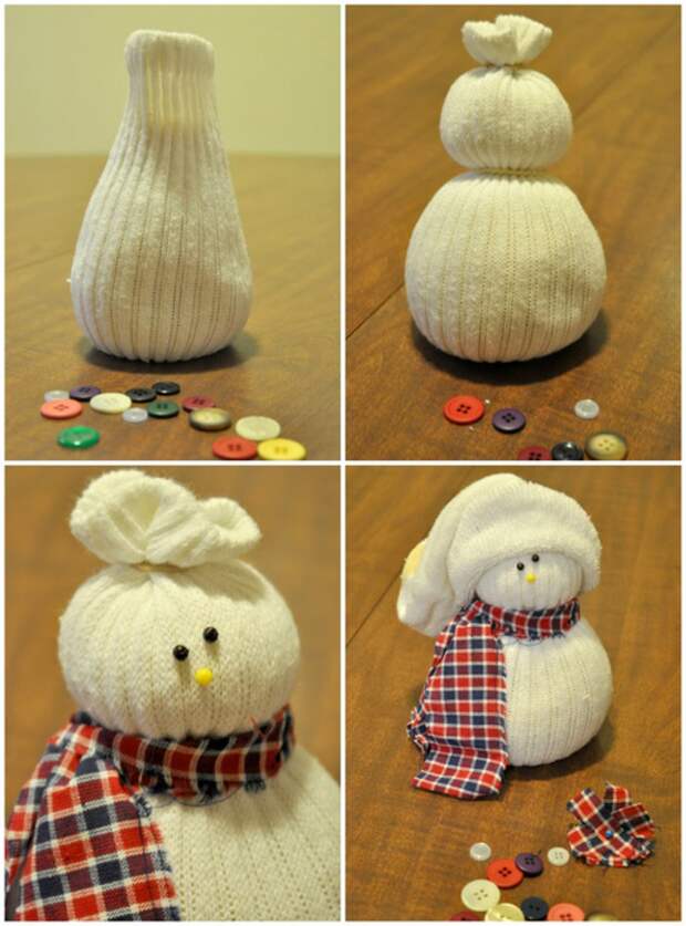Из ненужных носков получатся вот такие забавные снеговички. Вам понадобятся носки, рис для наполнения, несколько лоскутков и пуговиц.