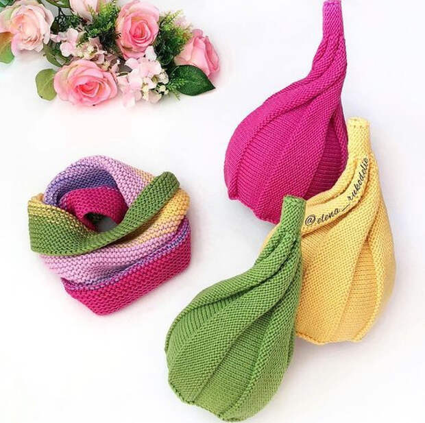 Так как луковица вяжется поперек, то она может даст растяжение, а чтобы шапочка хорошо облегала голову, то необходимо отнять 2-3 см от объёма головы. То есть если у вас объём головы 56 см, то отнимаем 2-3 см, значит вяжем полотно длиной 54-53 см.