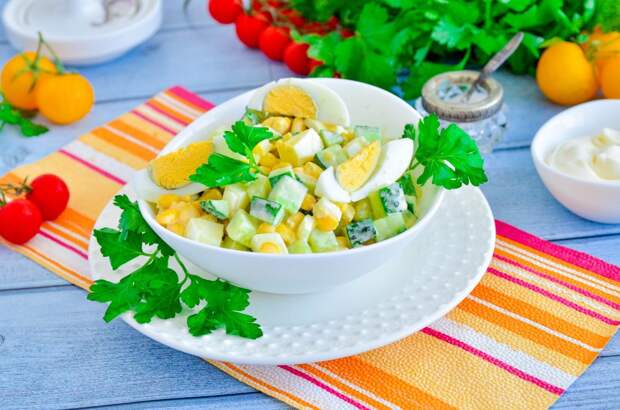 Самый бюджетный, простой и быстрый, на скорую руку! Салат из огурца, яиц и кукурузы содержит минимум ингредиентов, но, тем не менее, получается вкусным и сытным. Он отлично подойдет для быстрого перекуса, особенно, если яйца будут отварены заранее. Заправлять салат можно как майонезом, так и сметаной.