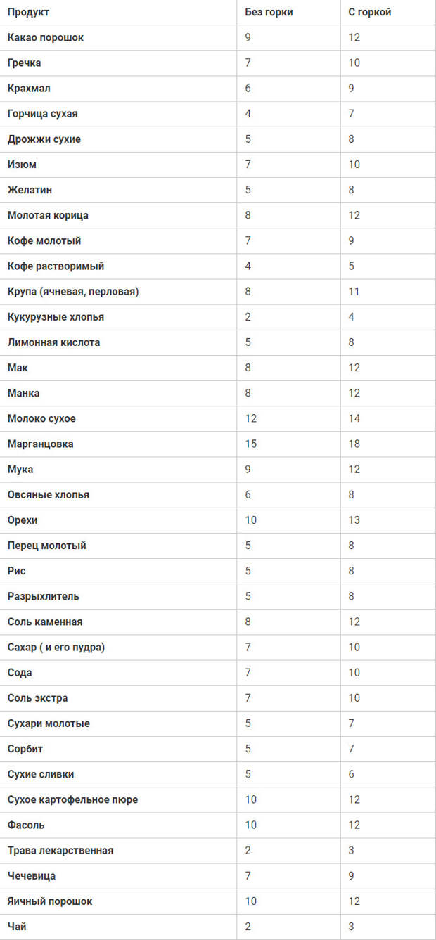 Такие ситуации, наверное, случались с каждым - захотели что-то приготовить и уже нашли рецепт в интернете, но там все указано в граммах, а у вас нет кухонных весов. В этом нет проблемы, если вы знаете сколько грамм в столовой, чайной и десертной ложках. Наши таблицы помогут вам в этом. Данные таблиц не обязательно запоминать, вы просто храните их под рукой и когда нужно - открывайте.