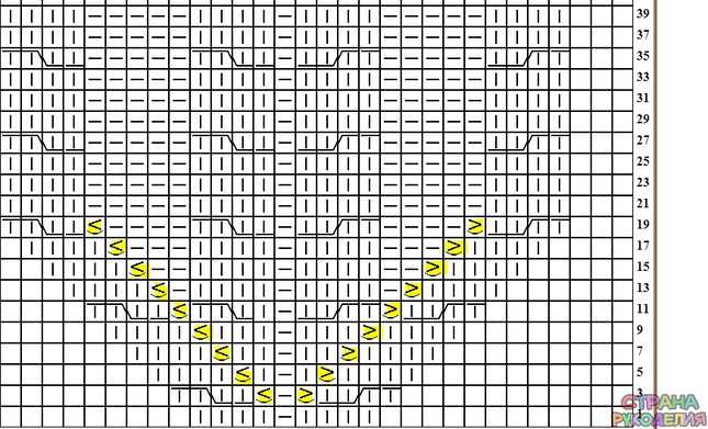То что отмечено желтым цветом на схеме вяжете так - из протяжки между петлями предыдущего ряда вывязываете изнаночную петельку. за счет нее полотно будет расширяться.