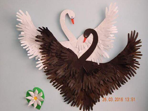 Вот таких чудесных лебедей вы можете сделать вместе с детишками, имея под рукой лишь бумагу, ножницы и любую плотную бумагу или картон для основы. Лебеди могут быть и белыми, и черными. Можно делать их из готовой цветной бумаги, а можно покрасить. В любом случае, занятие по обведению и вырезанию своих ладошек и их дальнейшему превращению, под вашим чутким руководством, в прекрасное панно, доставит вашим детям несказанное удовольствие!