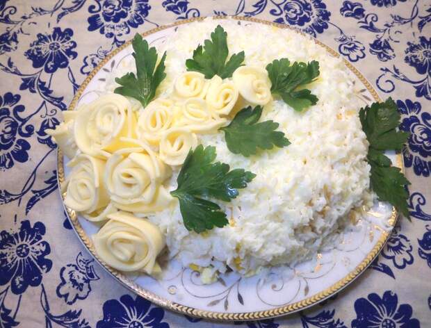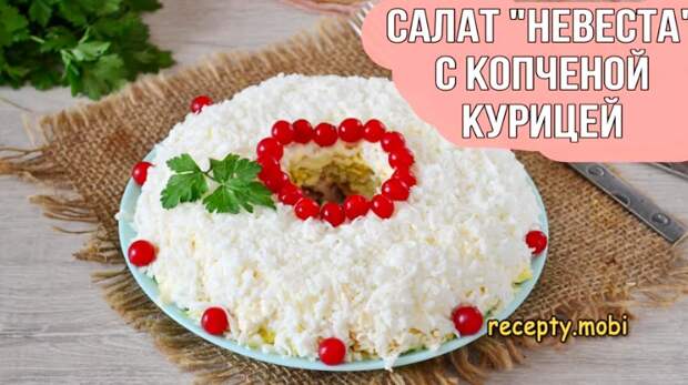 Очень нежный, праздничный эффектный салат "Невеста" готовится из доступных продуктов. Отличительным ингредиентом является лишь копченая курица, которая чудесно сочетается по вкусу с плавленым сыром.