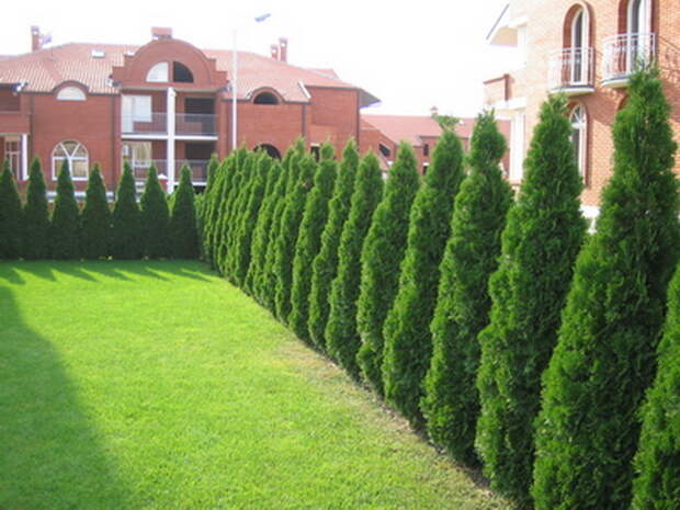 Вырастая, туи достигают большой высоты и формируют густую зелень.Регулярно подстригая эти растения, вы сможете придавать им любые формы и даже вырезать геометрические фигуры. Постепенно живой забор из туи превратится в оригинальный и стильный ландшафтный элемент.