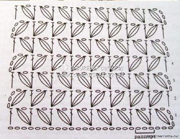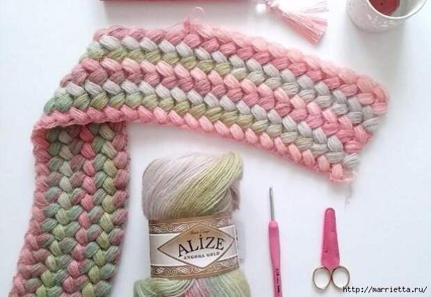 Красивый узор елочкой пышными столбиками вяжется крючком. Можно применить для вязания шарфика или шапочки.