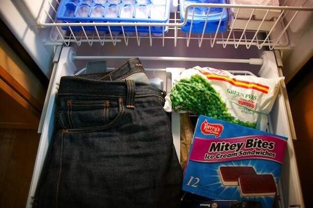 Чтобы избавить джинсы от неприятного запаха, положите их на ночь в морозильную камеру.